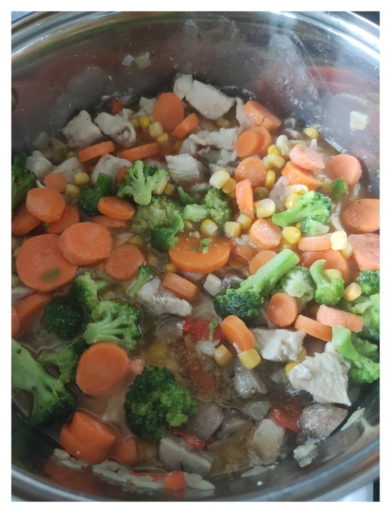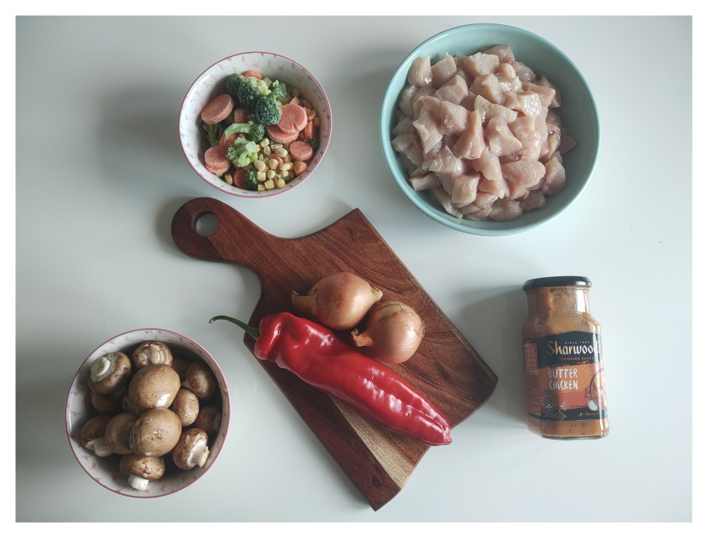Základom dnešného karí bude kuracie mäso a ako omáčku som zvolil “maslové kura”. Keďže som našiel jednu staršiu červenú papriku a mal som chuť na huby, dám tam aj tieto dve veci. Počul som už aj názory, že huby do karí nepatria, ale mne chutia a nevidím v tom problém. S vecami ako extra červená paprika nič veľmi nepokazím a minie sa. Nie je to asi ideálne, ale mne nijako jej chuť neprekáža, v tej omáčke sa stratí. A napokon na obrázku vidíte mrazenú zmes zeleniny, ktorú tam dávam kvôli chuti (hoci ju cítiť len mierne) a navýšeniu masy. Mne osobne to funguje. Môžete, nemusíte dať. Zmes je zložená z brokolice, mrkvy a kukurice.