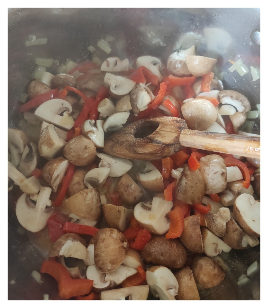 Postup asi veľmi do detailov nemusím písať. Osmažíme na kúsky nakrájanú cibuľu, pridáme kúsky kuracích pŕs, osmažíme a pridáme huby.