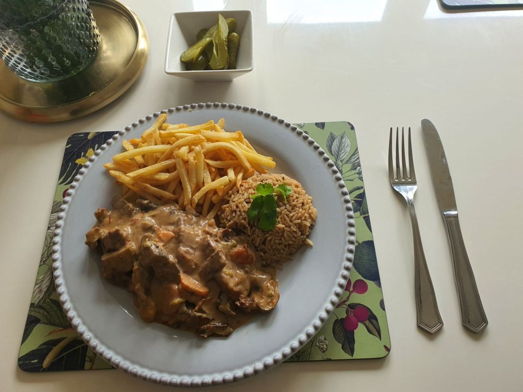 As a side I have rice and as all my friends surely know, french fries (I make these in the oven, there’s a good brand that turns out just right, I think they pre-fry them or something, not sure).