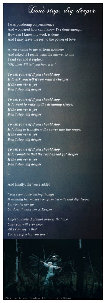 I always link some prompts to my favourite artist / art and as I couldn’t really visualise Laki as angel, but I wanted to keep the theme I’ve chosen a bit of a tribute to one of my most favourite bands, Anathema. And the album I will never get tired of, Eternity. I don’t think my version is as solemn as the art by Mez Meredith, but I like how it turned up.
